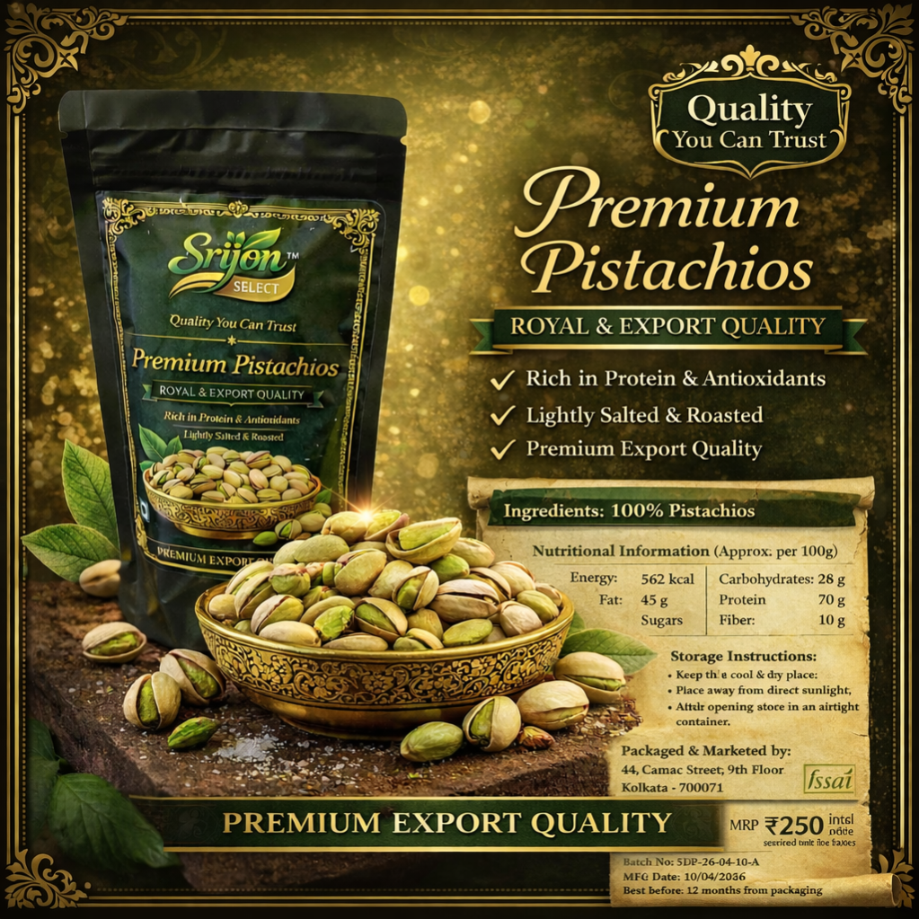 Premium quality pistachios, carefully selected for their rich taste and natural crunch. Packed with protein, fiber, and essential nutrients, these delicious nuts are perfect for healthy snacking anytime. Hygienically packed to preserve freshness, flavor, and quality in every bite