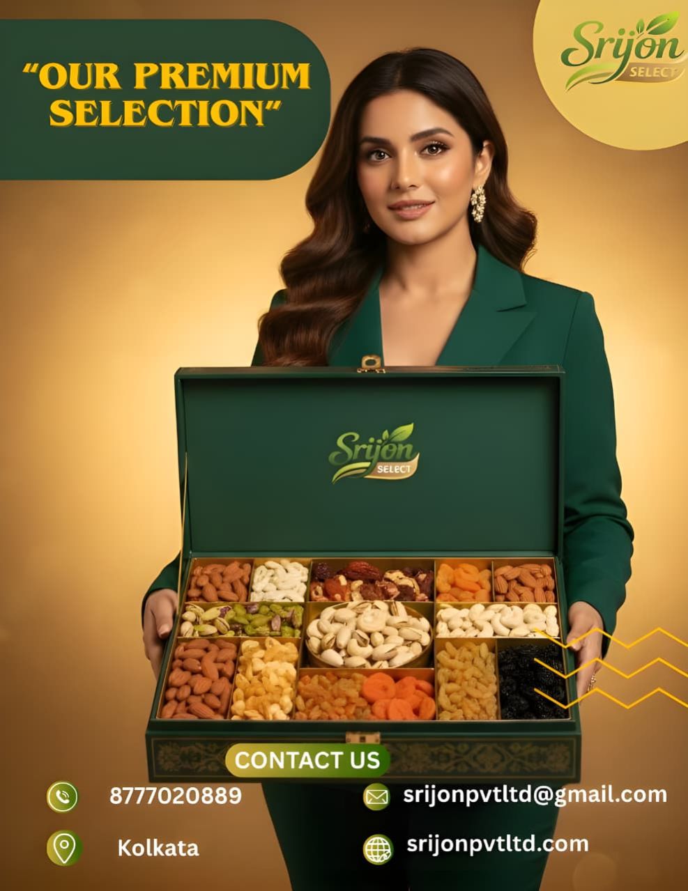 Srijon Ultra Premium Dry Fruit Hamper An opulent selection of Almonds (500g), Cashews (500g), Pistachios (500g), and Raisins (500g), crafted from the finest quality dry fruits.